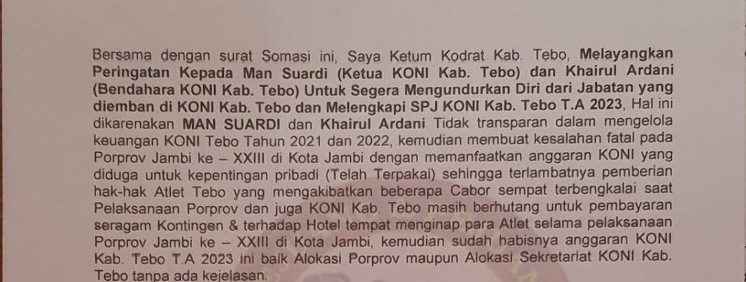 Tidak hanya itu, Cabor lain yang kecewa sempat mengirim somasi terhadap ketua dan bendahara KONI Tebo. Intinya tidak percaya dan meminta ketua dan bendahara mundur dari jabatannya.