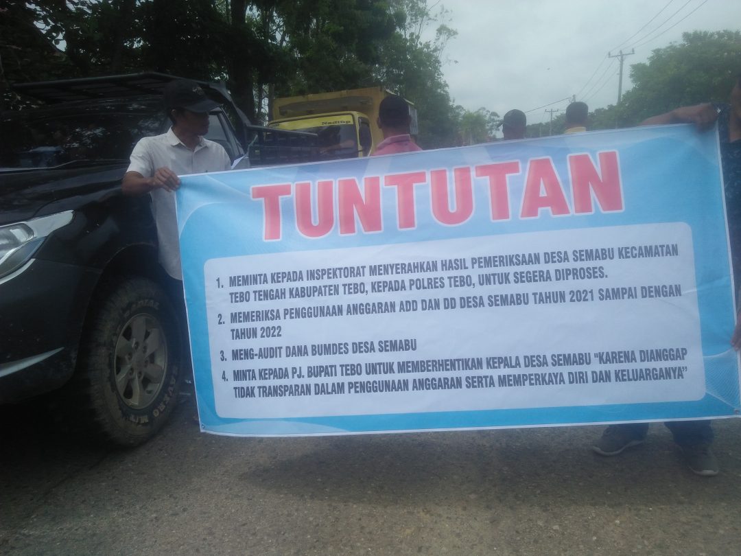 Kedatangan warga tersebut disambut dua orang pejabat Inspektorat dan bernegosiasi berkaitan dengan sejumlah tuntutan pengunjuk rasa. Menurut koordinator aksi, Suhendri mengatakan bahwa masyarakat peduli daerah hari ini, menuntut terhadap Inspektorat untuk menyerahkan hasil audit desa Semabu ke Polres Tebo dan meminta mengaudit ADD dan DD tahun 2021-2022.