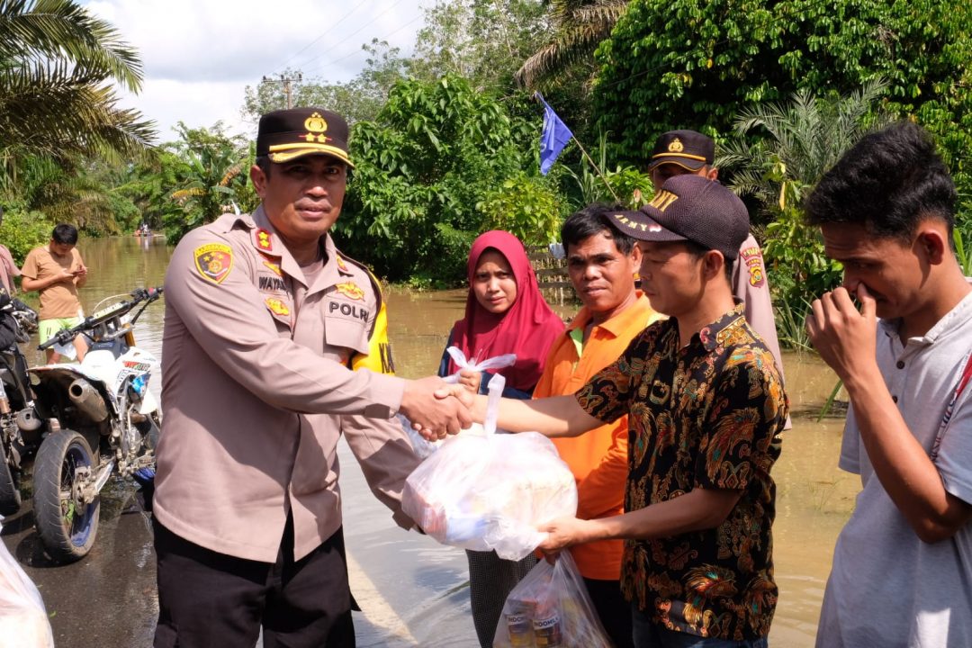 JambiOtoritas.com, TEBO – Kapolres Tebo, AKBP. I Wayan Arta Ariawan, S.H., S.I.K., M.H., bersama Ketua Bhayangkari Tebo Ny. Hesti Wayan Arta, memberikan bantuan kepada masyarakat yang terdampak banjir di Desa Aur Cino dan Desa Teluk Kayu Putih, Kecamatan VII Koto.