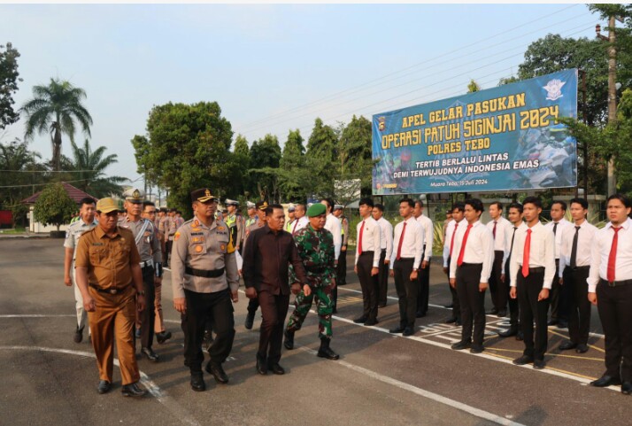 JambiOtoritas.com, TEBO – Polres Tebo melaksanakan apel gelar pasukan pada pagi ini sebagai tanda dimulainya Operasi Patuh 2024. Apel tersebut dipimpin langsung oleh Kapolres Tebo, AKBP Dr. I Wayan Arta Ariawan, S.H., S.I.K., M.H., dan dihadiri oleh Unsur Forkopimda Kabupaten Tebo, jajaran perwira serta personel Polres Tebo.