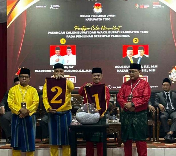 JambiOtoritas.com, TEBO – Pasangan calon bupati Tebo, Aspan – Wartono dalam penetapan nomor urut pasangan calon oleh KPUD kabupaten Tebo, Senin (23/9/2024) mendapat nomor urut 1. Sementara pasangan calon ARB – Nazar mendapatkan nomor urut 2. Paslon AsTon berharap penyelenggara KPU tegak lurus dan mencegah terjadinya penyebaran isu – isu politik yang menyangkut suku, agama, ras dan antargolongan (SARA)
