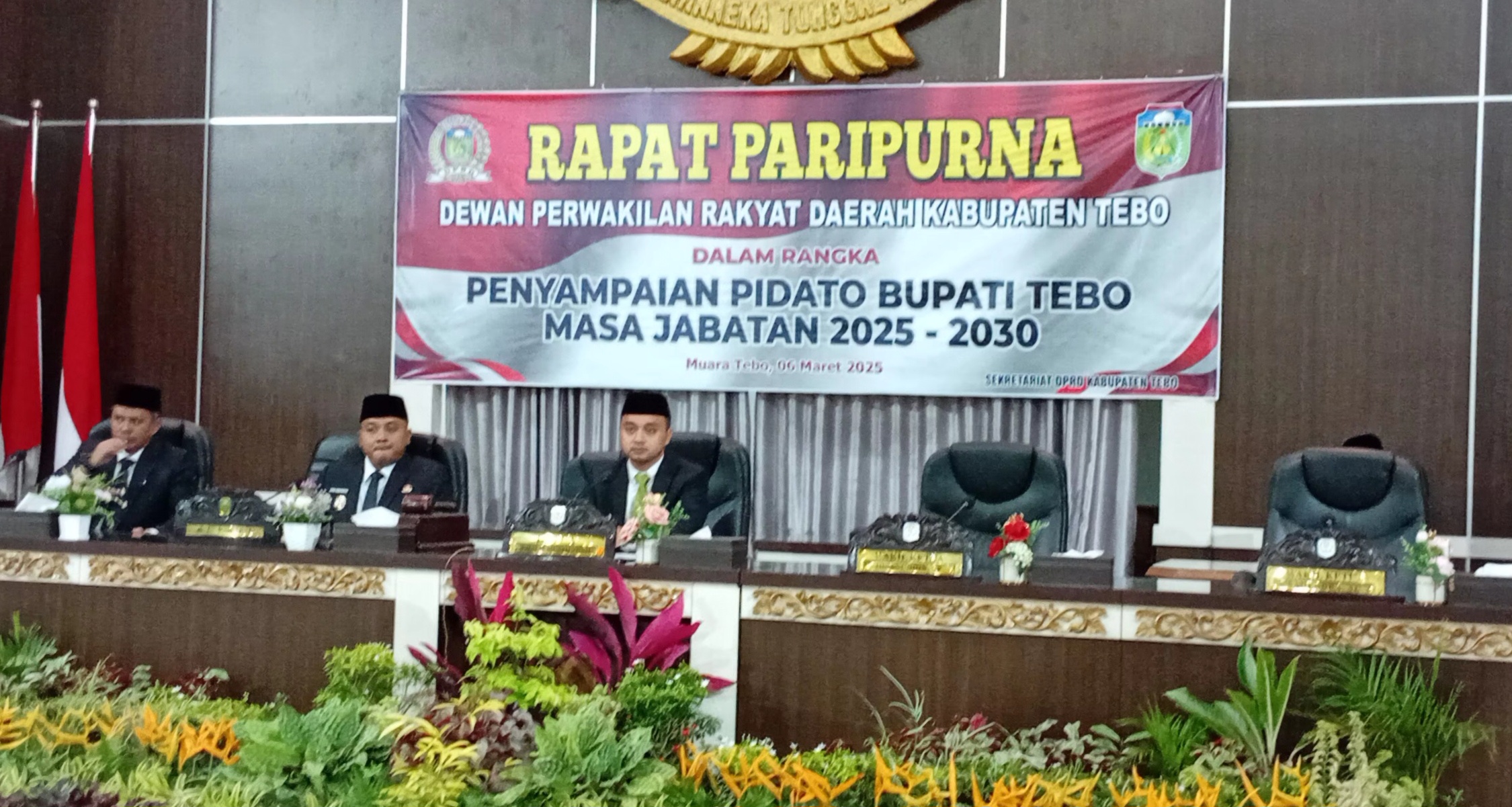 JambiOtoritas.com, TEBO – Rapat paripurna DPRD Tebo dalam rangka penyampaian pidato bupati Tebo masa jabatan 2025- 2030, Kamis (6/3/2025) dilangsungkan di Aula utama gedung DPRD kabupaten Tebo, petang. Namun disisi lain, rapat paripurna itu tak diikuti dua pimpinan dan sejumlah fraksi.