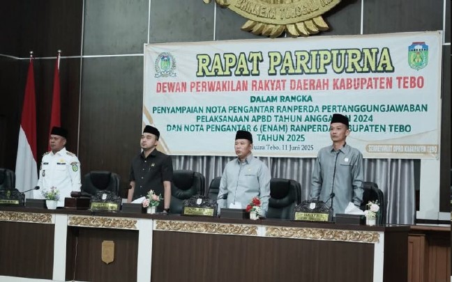 JambiOtoritas.com, TEBO – Dewan Perwakilan Rakyat Daerah (DPRD) Kabupaten Tebo menggelar Rapat Paripurna dalam rangka Penyampaian Nota Pengantar Rancangan Peraturan Daerah (Raperda) tentang Pertanggungjawaban Pelaksanaan APBD Tahun Anggaran 2024. Kegiatan ini berlangsung di Aula Utama DPRD Kabupaten Tebo pada Rabu, (11/06/2025), dan dihadiri oleh unsur pimpinan serta anggota DPRD, jajaran eksekutif, dan tamu undangan lainnya.
