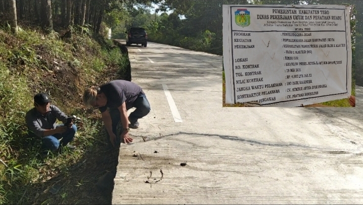 JambiOtoritas.com, TEBO – Proyek pembangunan jalan rigid beton TA 2025 senilai 5 milyar di blok E kecamatan Rimbo Ilir, sumber dana bagi hasil (DBH) sawit belakangan menjadi perhatian bupati Tebo, Agus Rubiyanto dan wakilnya, Nazar Efendi. Dia melihat langsung kondisi jalan sepanjang 500 meter yang dikerjakan oleh CV. Sumber Artha Bumi Swarna itu, diinformasikan mengalami banyak keretakan.